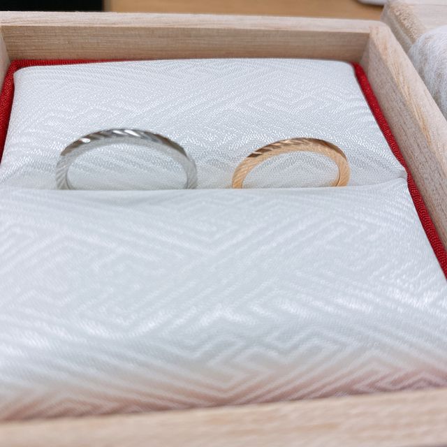 真ん中だけでなく横の部分にも彫りが入っていて、どこから見ても違った雰囲気に見えるし、なにより職人のこだわりも担当さんから聞き、気に入りました。