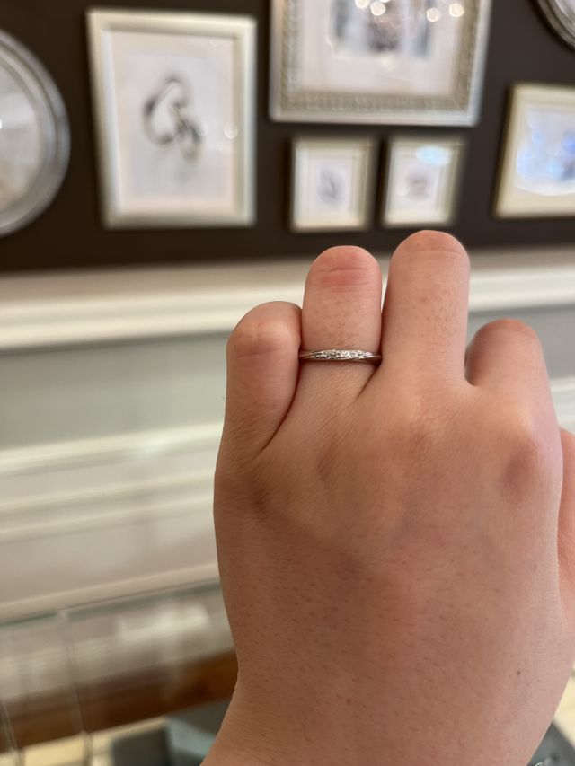 きらびやかなダイヤモンドが輝く綺麗なプラチナの指輪です。つけている時もキラキラと輝いていました。ダイヤモンドの部分もとても繊細なので、上品な印象です。着けた感じも全然違和感がなかったので、とても着けやすいなと思いました。
