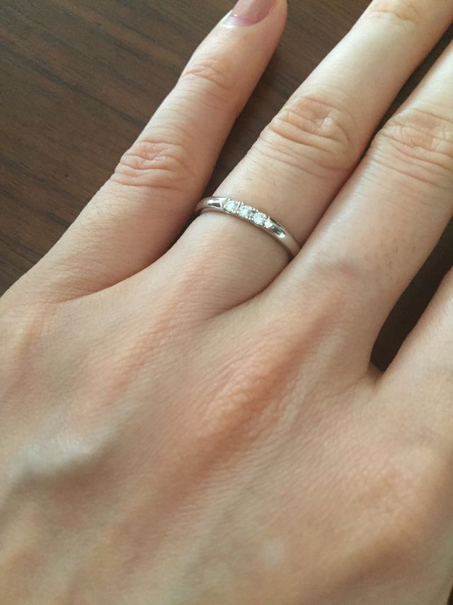 ダイヤ1つのタイプのものと迷いましたが、3つの方が華やかだったので、こちらにしました。プラチナは傷がついてくすんでしまいますが、ダイヤがついている分、くすむ部分が少なくなるので、こちらにして良かったと思います。