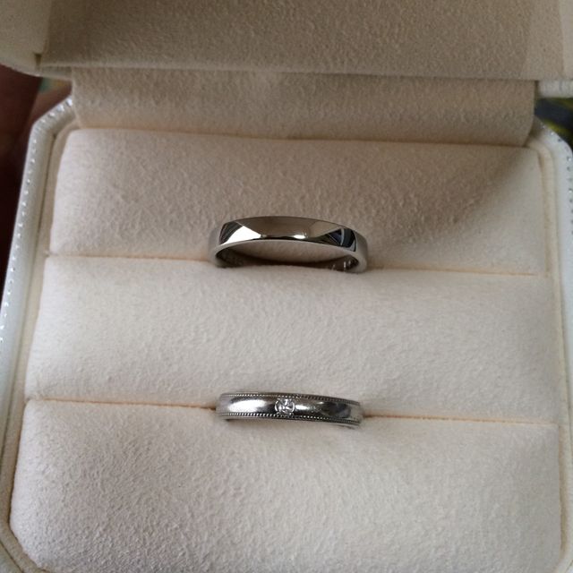お互いシンプルで飽きがこない指輪にしようと思っていました。お互いほしいデザインが違ったので、同じ型のものではありませんが、満足です。