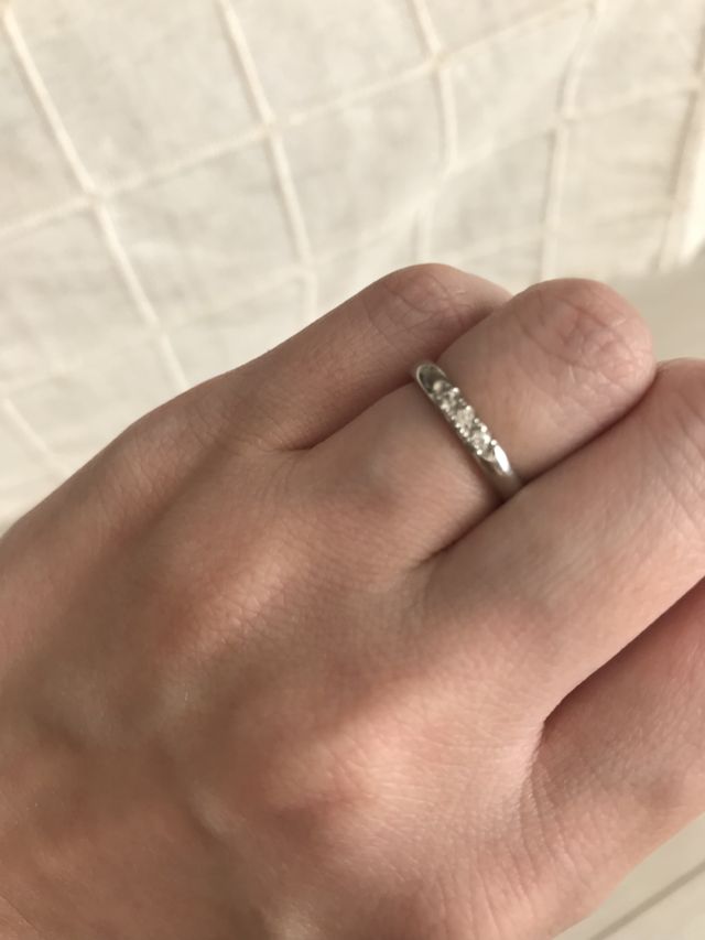 着用した時にダイヤモンドが綺麗で細過ぎないこの指輪に惹かれました。ダイアモンド約0.06ct、リング幅最大約2.5mmです。普段使いでもダイヤが取れたり引っかかったりすることもないです。婚約指輪などと重ねた際に凄い輝きがあり豪華です。結局キラキラしたダイヤモンドに惹かれました!