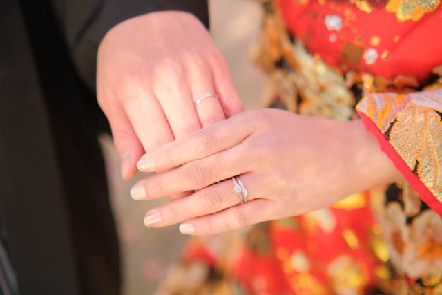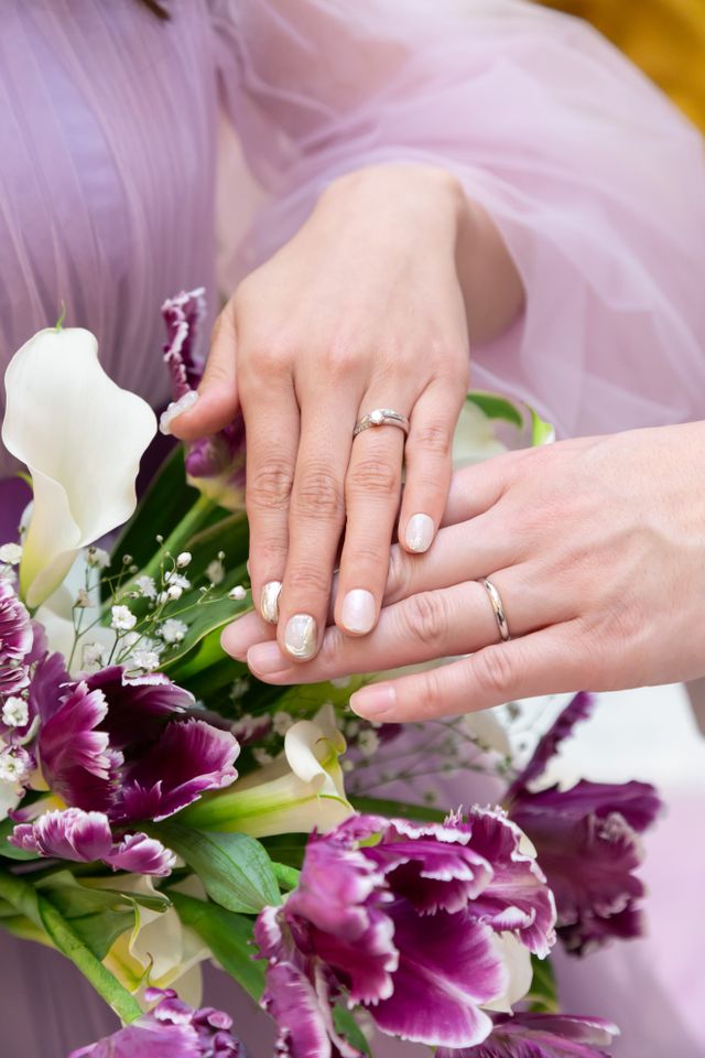 男女とも、少しVラインになっているので、指が長く綺麗に見えるデザインだそうです。女性用は、婚約指輪と重ね付けするのを想定してダイヤと重ならないようにこの形のものを選び、よくある一つ石のデザインではなく、単体でつけても可愛いかなと思って、石ありのデザインにしました。
