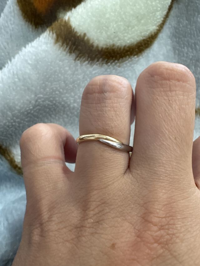 K18イエローゴールドとPT950の2つを使ったリングで2色面やゴールドのみプラチナのみを気分やTPOで使い分けが3通りできてコーデにも合わせやすいです