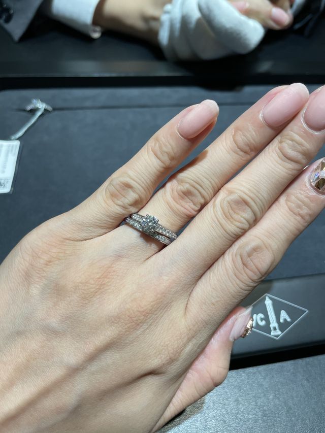 フルエタニティリングでダイヤモンドがキラッキラでした!フルエタニティだとペアリング感が薄れてしまうので、候補になかったのですが、指輪をはめた瞬間にダイヤのキラキラにときめいてしまいました!