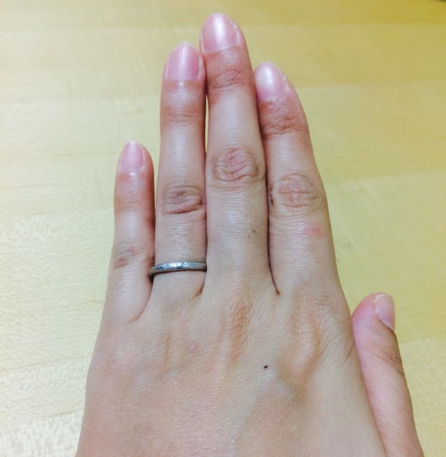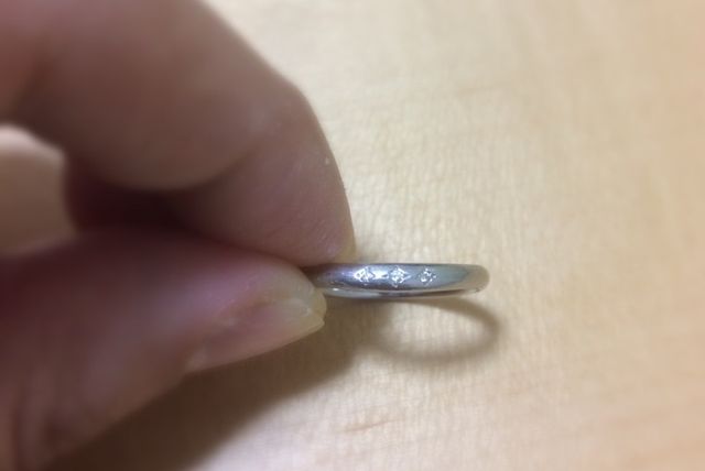 女性用にダイヤが3つ埋め込まれているのもあまり見かけず、何よりひし形の加工がとてもかわいくデザインは一目ぼれでした。