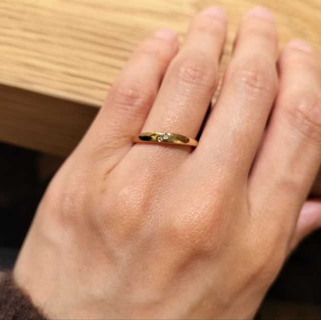 真ん中にかけて幅広になっていくデザインで、メレダイヤが2つという少し珍しいデザインに惹かれました。(ダイヤの個数は調整できるようです)また、こちらは地