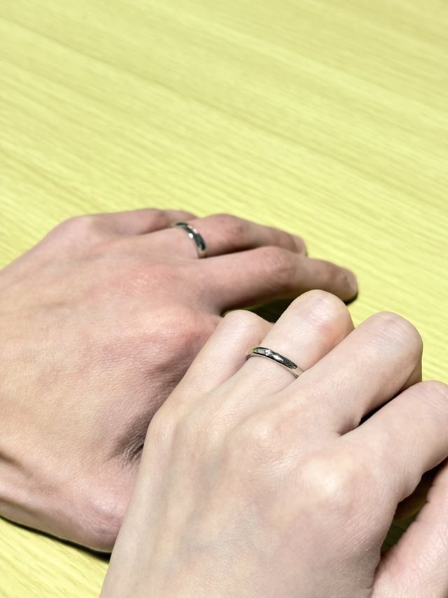 女性用はダイヤが中に埋め込まれています。仕事中に傷つけてしまう心配があり、こちらにしました。シンプルで飽きがこないデザインが気に入っています。ひし形のダイヤがこれからの二人を照らすように…と言った意味だったかと思いますが、愛着がわきます。