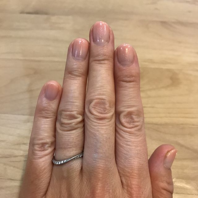 最初V型が希望でしたが、色々見せていただく中で、こちらのデザインは身につけた時に、どちら側を上に持って来るかによって印象が変わるので、素敵だと思いました。また、たまにイベント事に参加する際に婚約指輪を一緒に付けた時に、少し隙間は出来ますがV型よりもしっくり行きます。とても気に入っています。