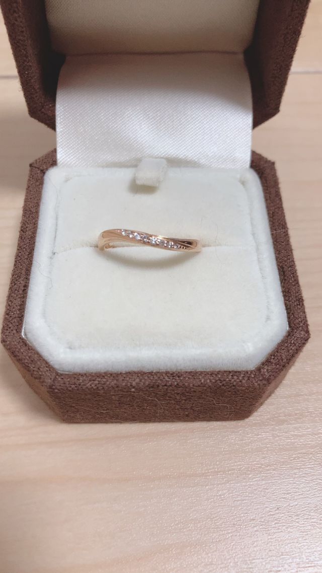 指があまり細くない上に色黒なので、肌なじみのいいカラーで、指が綺麗に見えるものにしました。ずっと付けるものなので付けてる時に違和感を感じない太さで、少し波打つようなリングの形と小さなダイヤモンドが埋め込まれているのでシンプル過ぎず、指を綺麗に見せてくれるこのデザインが気に入りました。
