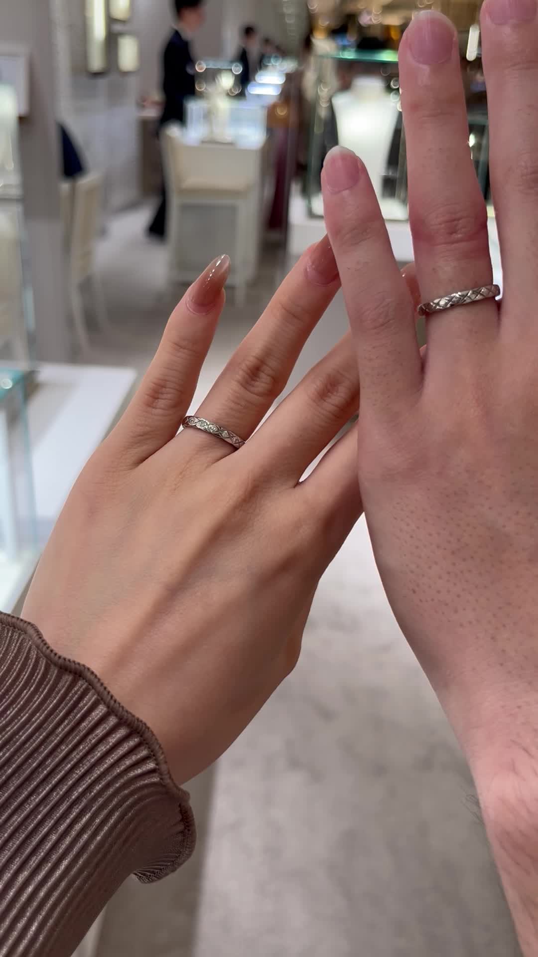 有名デザインのココクラッシュも見ておきたくて、店舗に行きました。写真で見てた時は少しゴツイかな?と思ってたのですが、いざ付けてみると馴染みが良いデザインでした。単体付けだとめちゃくちゃ可愛いですが、王道デザインの婚約指輪と重ね付けすると少し喧嘩するかも?と思い購入には至りませんでした。でもとってもかわいい〜