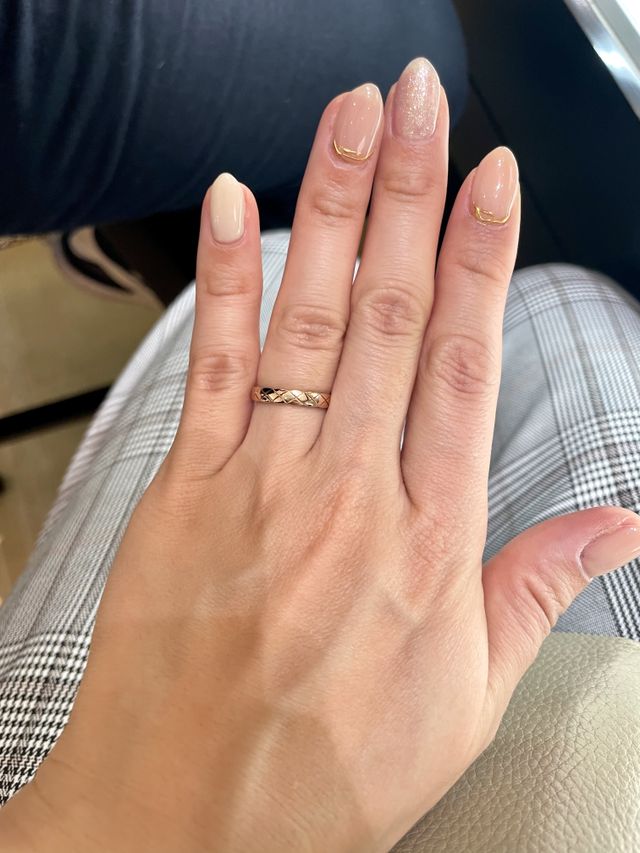 シャネルなので、つけているだけで気分が上がります。また、見たことあるのに他の海外メーカーのものだとみんなつけていますが、案外友人でつけている人がいないので、人と被らないものがよいと思っている人にとてもオススメの結婚指輪です。