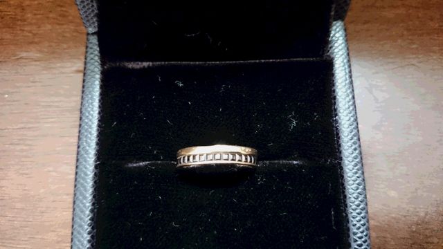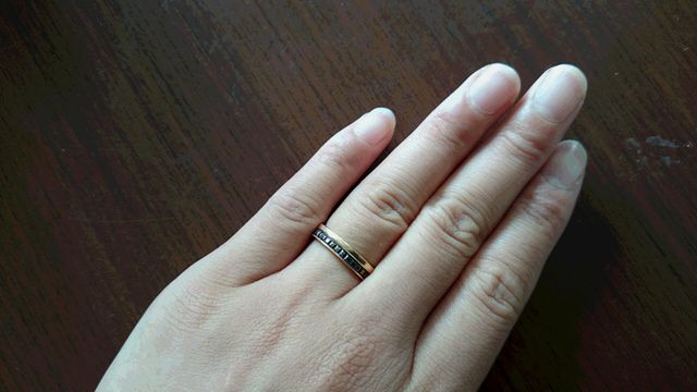 色が黒い私たち夫婦にはシルバーの指輪よりも肌に自然になじむ色です。