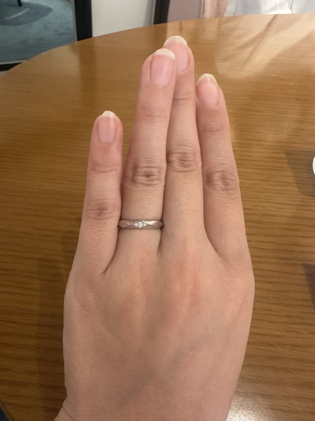 ダイヤがついた指輪がよく、色々見せていただいた中で、あえてシンプル1箇所に絞ることで映えるデザインだったことが気に入りました。太い指輪はあまり似合わないかなと思っていましたが、こちらはカットがおしゃれで素敵でした。