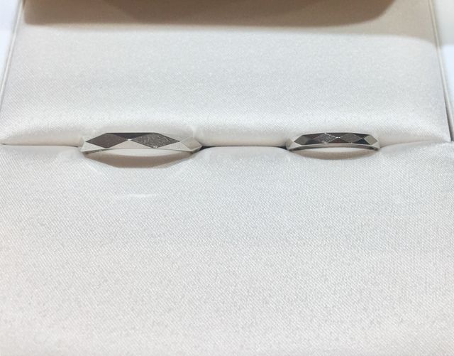 プラチナ。彼とはデザインもお揃い。白Tにデニムなどカジュアルなファッションにもなじむシンプルなもの。デイリーにはめたいと思えるファッション性があり、長くつけても飽きのこないデザイン。そして、何より彼もずっとつけたいと思うデザイン。と言う観点から2人でチョイスをして選びました。