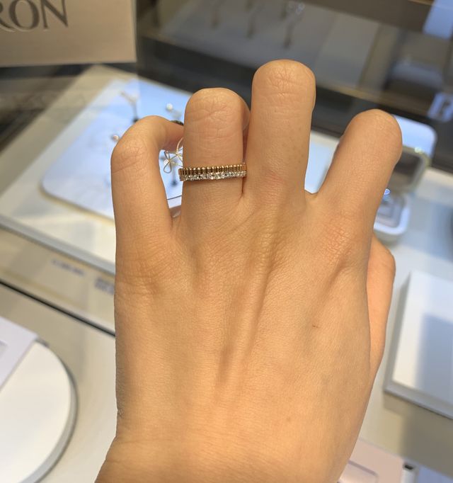 ゴールドの色のものか、シルバーのいるのものかとても悩みました。最終的にシルバーにしましたが、婚約指輪と重ねるとゴールドが映えとても可愛いかったです。