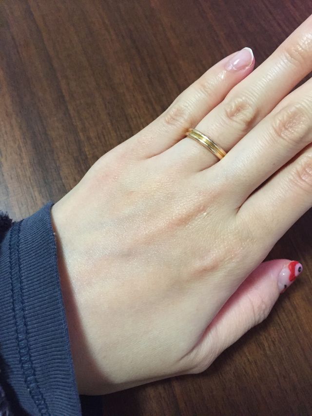 そして私のこだわりで、自分のものはゴールドがいいと決めていたので、このブシュロン・ゴドロンはどんぴしゃでした。商品名としてはピンクゴールドなのですが、ゴールドに限りなく近い色だと思います。指馴染みがとてもよく、他ブランドのエンゲージ(プラチナ・ダイヤモンド)ともとてもよく合います。