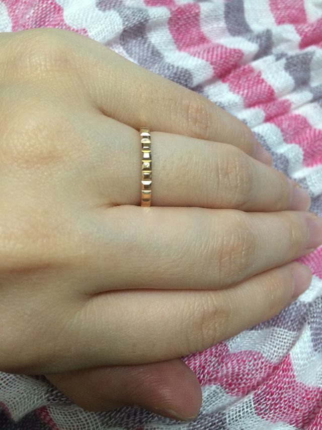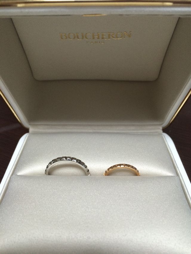 パリの石畳をイメージしているという、独特の美しいデザインが決め手でした。ファセットとゴドロンもとても素敵で決めかねていたのですが、彼の「これがいい」の一言でポワント ド ディアマンに即決しました。彼はプラチナで通常の太さのディアマン、私はピンクゴールドで通常より細めの太さのミニディアマンを購入しました。