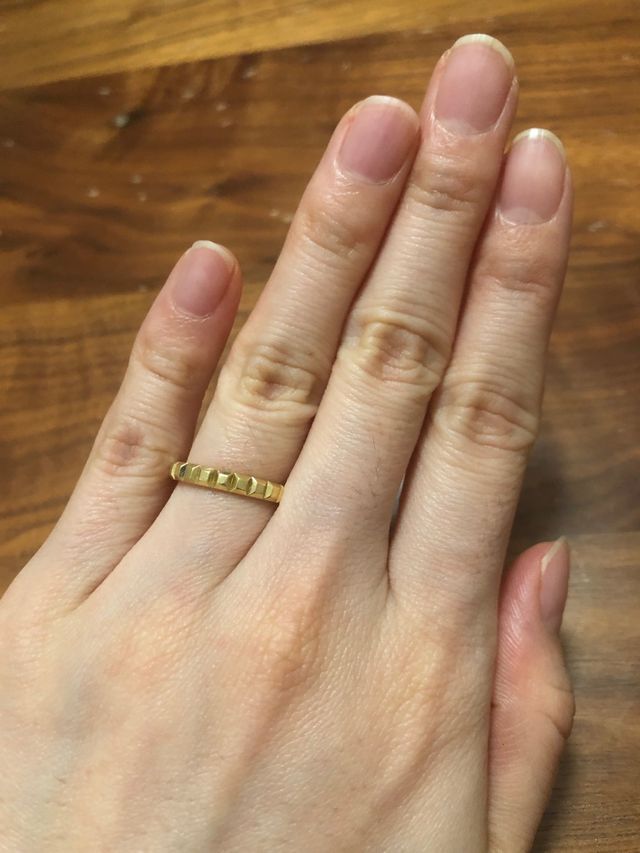 クルドパリというコレクションで、パリの石畳をモチーフにしたモダンなデザインが気に入り、購入しました。イエローゴールドかプラチナか素材を悩みましたが、華やかで肌なじみも良かったイエローゴールドに決めました。
