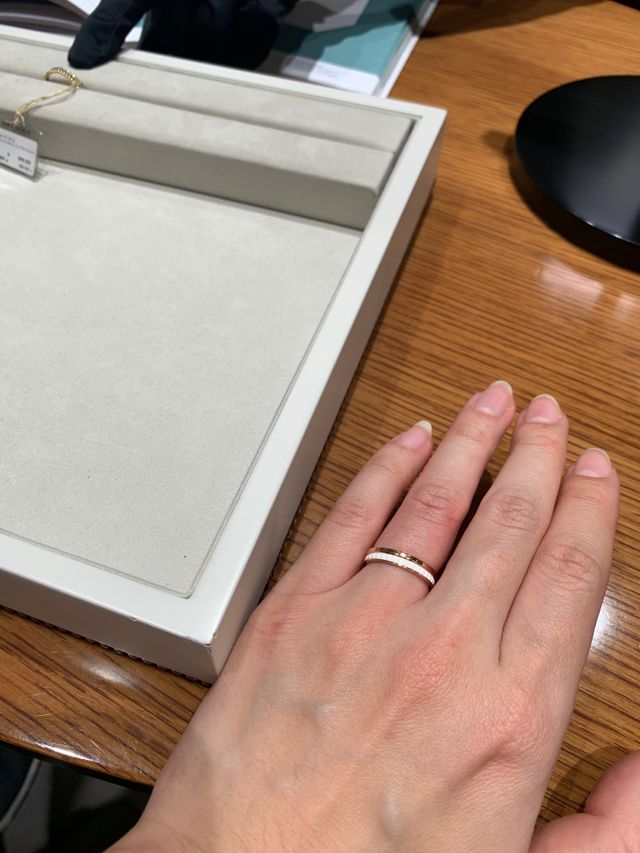 SNSをフォローしていて、キャトルリングのデザインが好きで一度試着してみたかった。色はピンクゴールドで、白のセラミックとのコンビネーション。肌の色に合っていて、とてもよかった。他に、茶色?のセラミックもあってどちらも良いと思ったが、歳を重ねていくことを考えると茶色のセラミックの方が良いのかも。白は少し若い感じがする。