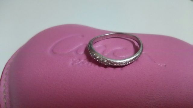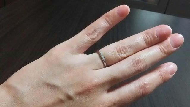 細身でエンゲージリングと重ね付がしやすいデザインなので気に入っています。プラチナ素材で小さくてもダイヤモンドが入っている指輪を探していました。この指輪を見つけた時価格もデザインもまさに私の理想通りだったので一目で決めました。