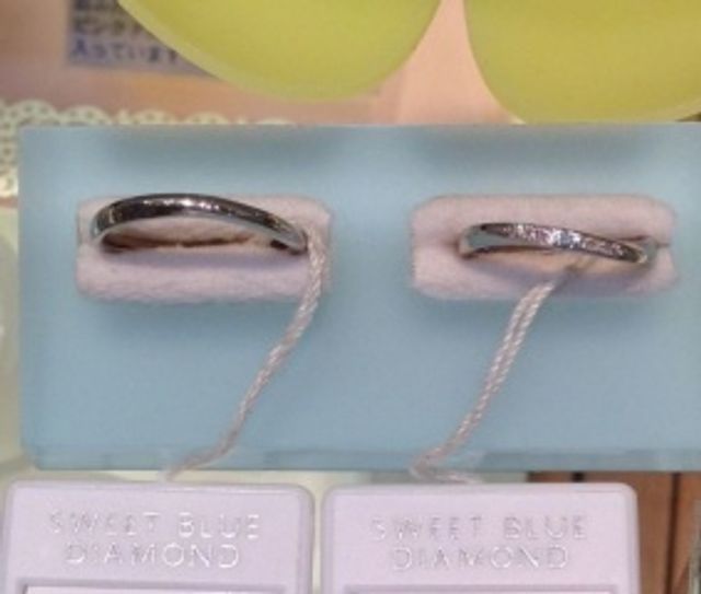 細身のリングにまっすぐにダイヤがデザインされてしまうと、違和感がありますが、この指輪のように少し動きがあると気品があるように思えます。