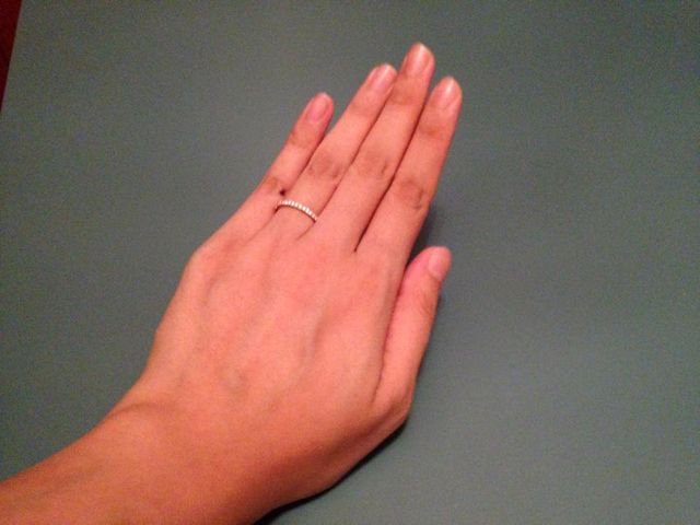 重ね付けをすると指輪と指輪の間に隙間が出来てしまうデザインが多い中、この指輪と婚約指輪(DBclassic)はピッタリと密着し、まるで1本の指輪のような一体感があり、それが決めてとなりました。