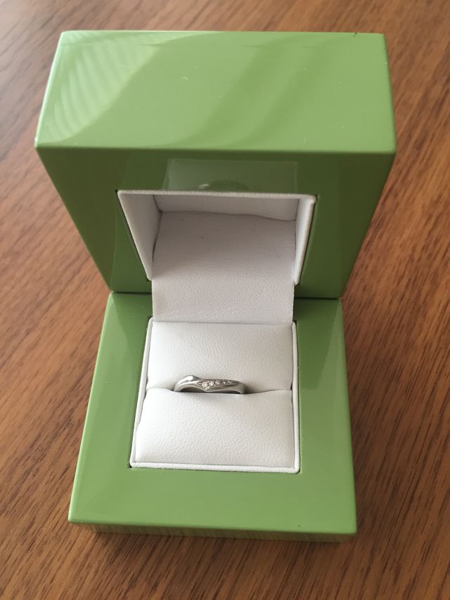 主人が職業上、シンプルな指輪しか着用できないので、私もプラチナでダイヤが少しついてて指が綺麗にみえるという点を重視しました。いかにも結婚指輪っぽいものは苦手でしたが、指にはめてみるととてもしっくりきて、指が綺麗に見えたので、決めました。