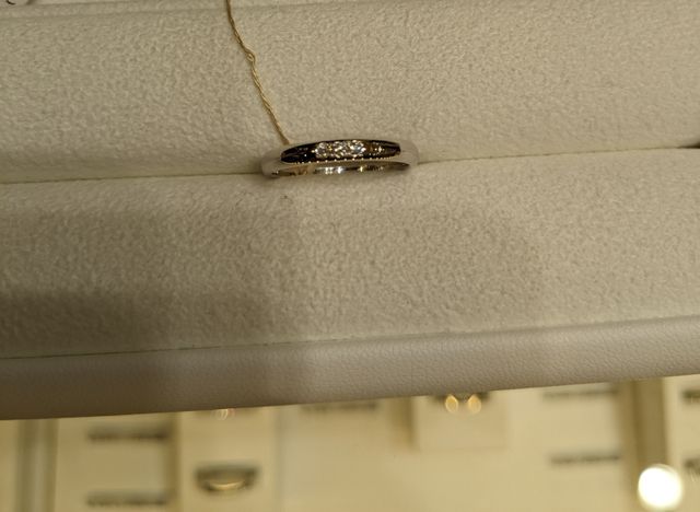 ダイヤが3つ並んでいるストレートラインの指輪です。シとてもつけ心地が良かったです!3つのダイヤが存在感があり、シンプルすぎず、かと言って派手すぎるわけでもなく、毎日身につける結婚指輪にはちょうどいいデザインでした。