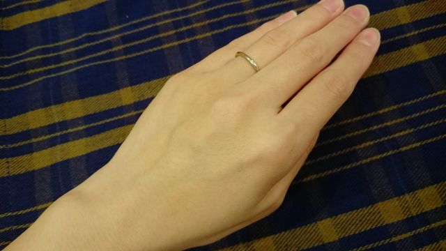結婚指輪は毎日つけていたいと思っていたのですが、普段指輪をしていなかったので、毎日つけていても手に違和感のないようなシンプルなデザインを探していました。料理をしていても、石が落ちたりしないように飾りもあまりないものを考えていて、婚約指輪をアーカーで買ったので、そのアーカーのウェディングラインであるこちらのPEMEでシンプルな指輪を選びました。