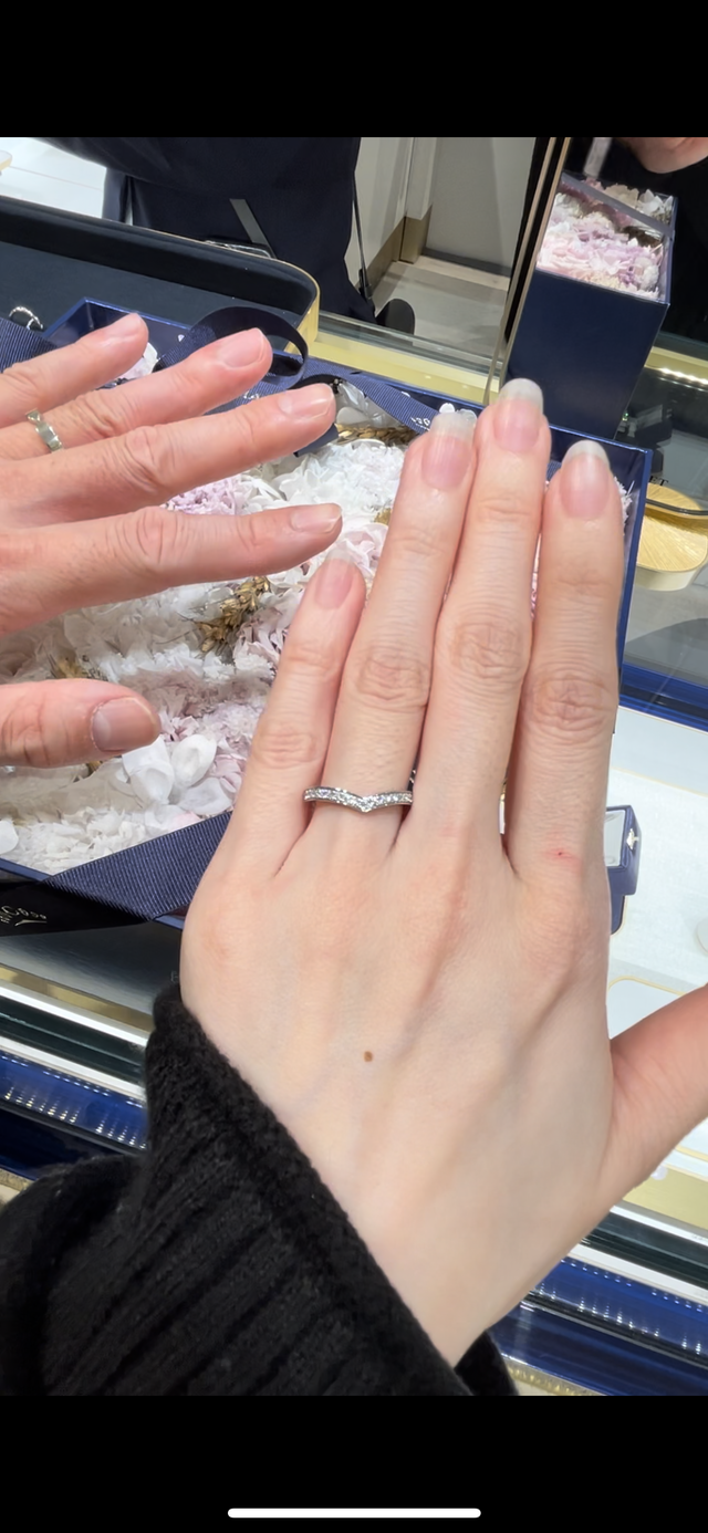 ショーメの指輪はどのデザインも素敵でした。VかUの形の指輪が気になってたのでこちらを見せていただきましたが、どこからみてもキラキラして見えるという点が好みでした。ダイヤなしの指輪もありますが、ダイヤありの方が素敵です。