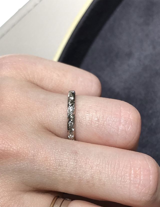 私自身、骨張った手をしているので、華奢過ぎるデザインでないことと、ダイヤが付いていることが条件でした(笑)