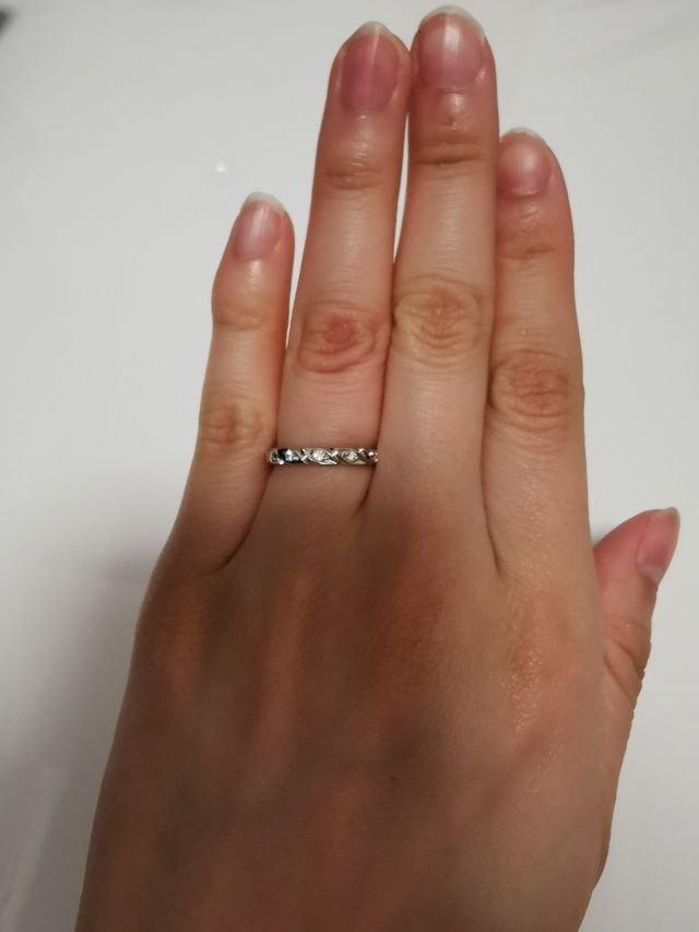 ダイヤ一粒の方と迷いましたが、エタニティリングのようにつけられるので8粒の方を選択しました。引きで見るとトルサードの模様が立体的に見えて、とってもキラキラして見えます!