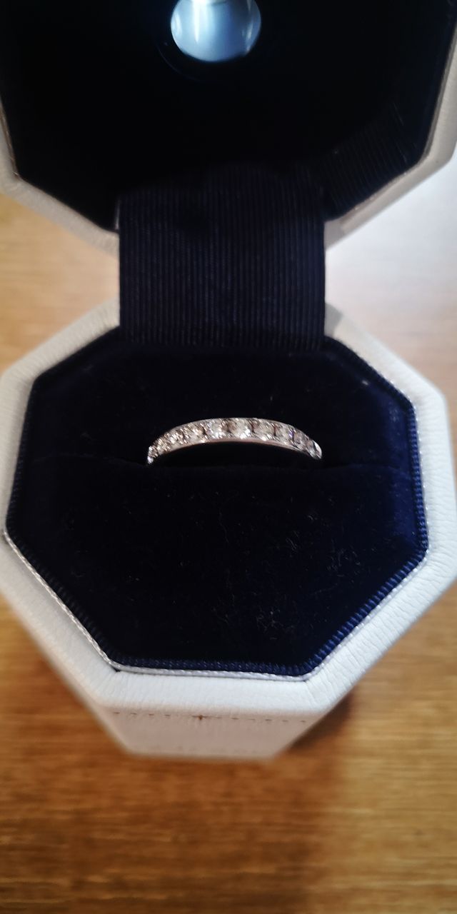 このリングは太さが2.9 mmあり、長く使う結婚指輪なので丈夫さも満たしておりダイヤの大きさも揃っていて輝きが素晴らしかったのでとても気に入りました。