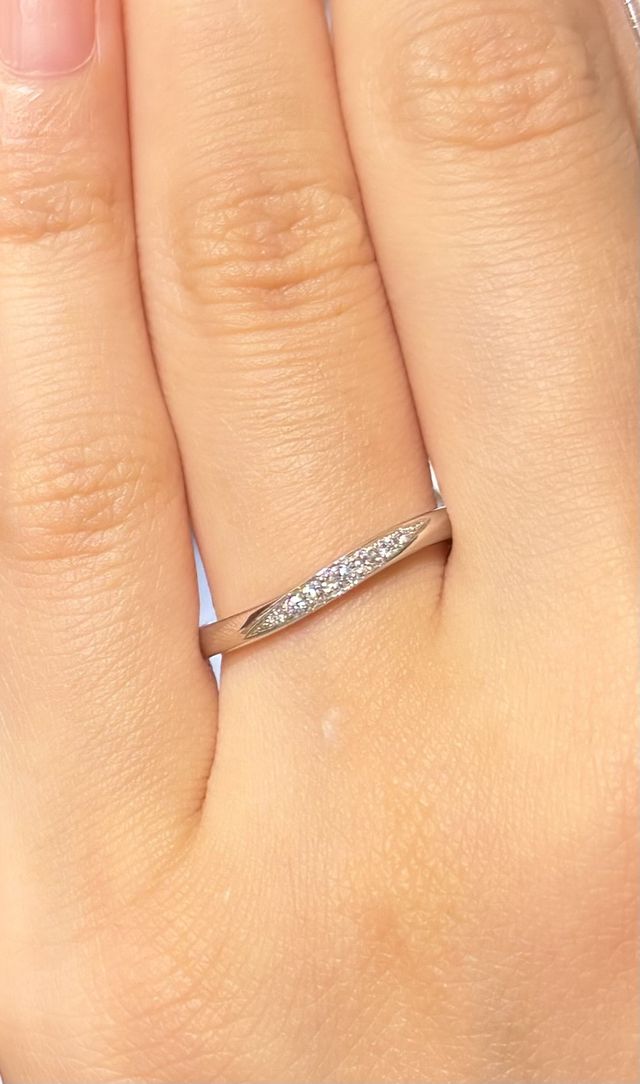 ストレートタイプのとてもシンプルなデザインの指輪です。女性用のリングは正面からサイドにかけてだんだんと細くなるようにダイヤモンドがあしらわれます。カッターズブランドということもありとてもダイヤの輝きが美しいです。