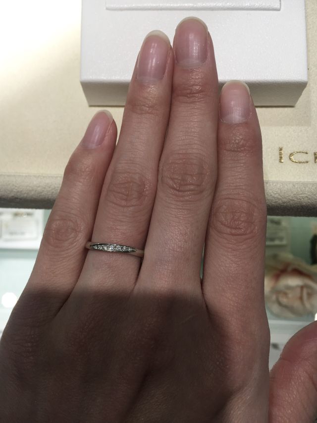 緩やかなS字で、自分の指にとてもフィットしました。太さ、ダイヤの入り方などすべてちょうどよく、派手すぎず地味すぎず上品なリングでした。