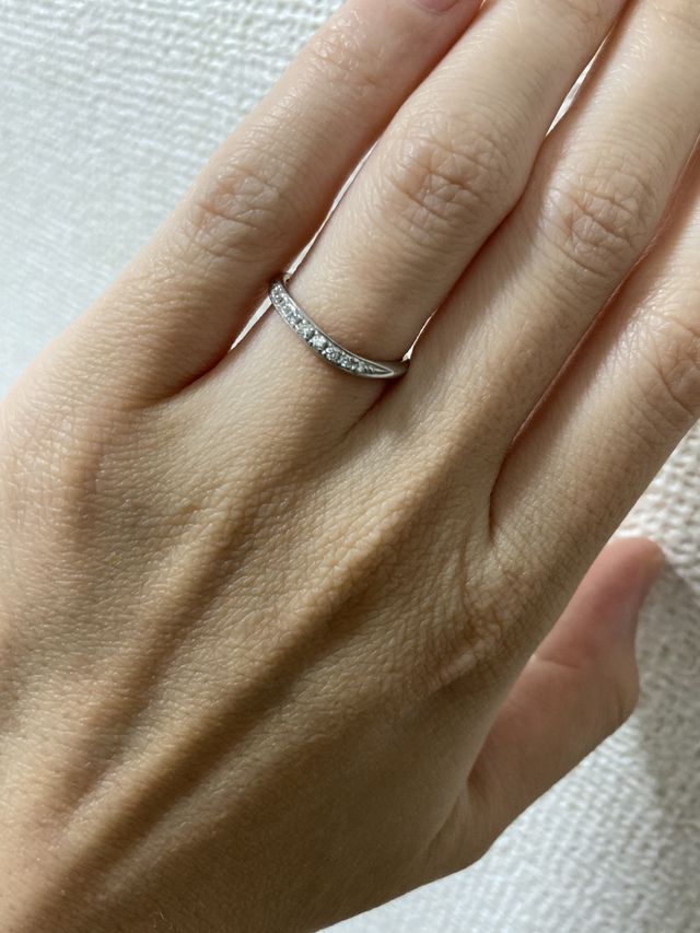ダイヤは絶対欲しくて、毎日付けていたいので邪魔にならないかつ指が綺麗に見えるよう細身のデザインのものを選びました。カーブがかかっていて、対面した相手側からはとてもキラキラして見えるのが気に入っています。