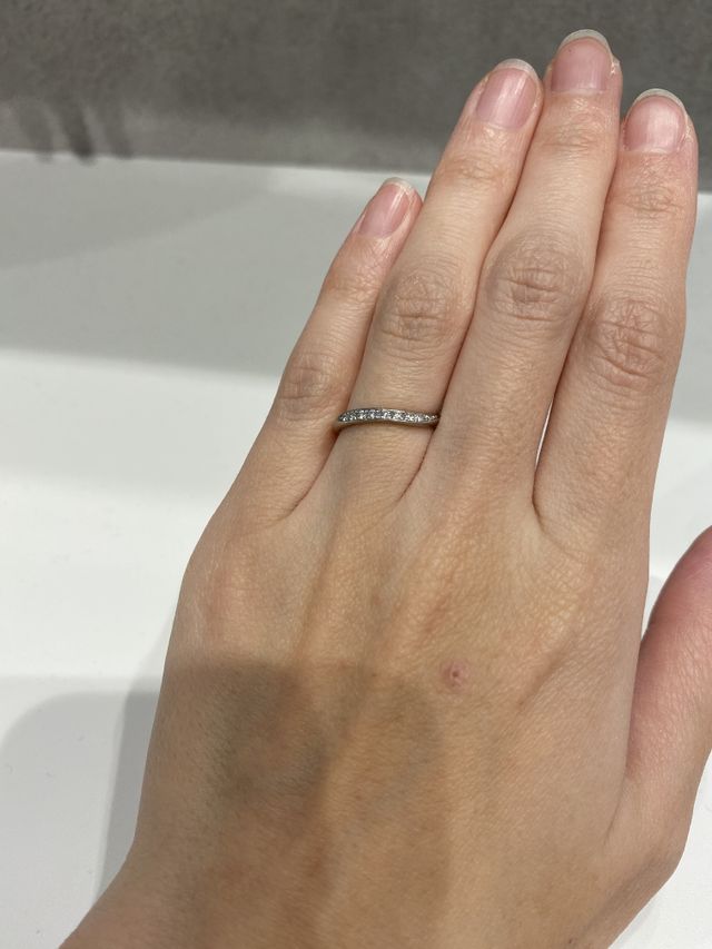 色々と付け比べてみて、婚約指輪と重ねた感じが1番しっくりきてこちらのデザインにしました。自分側から見るより相手から見た方がダイヤがキラキラして見えるのも気に入っています。