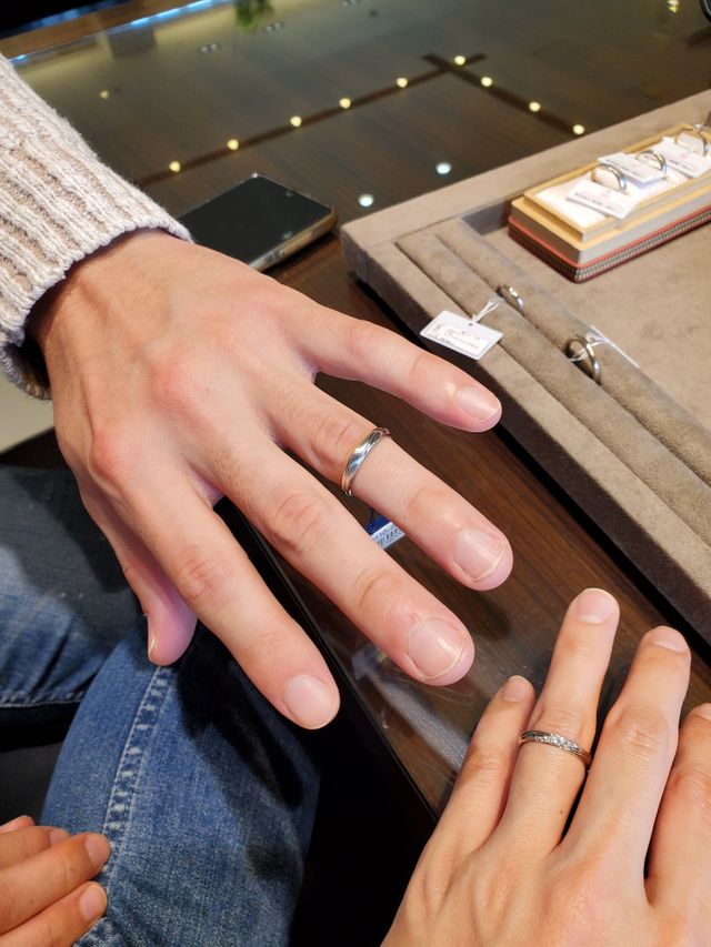 スタッフさんに選んでいただきました。出来ればコンビ素材で、太めの指輪が良いという条件でお話をしたところ、いくつかの指輪をお勧めしていただき、サムシングブルーの指輪が一番しっくりと指馴染みが良く、気に入りました。