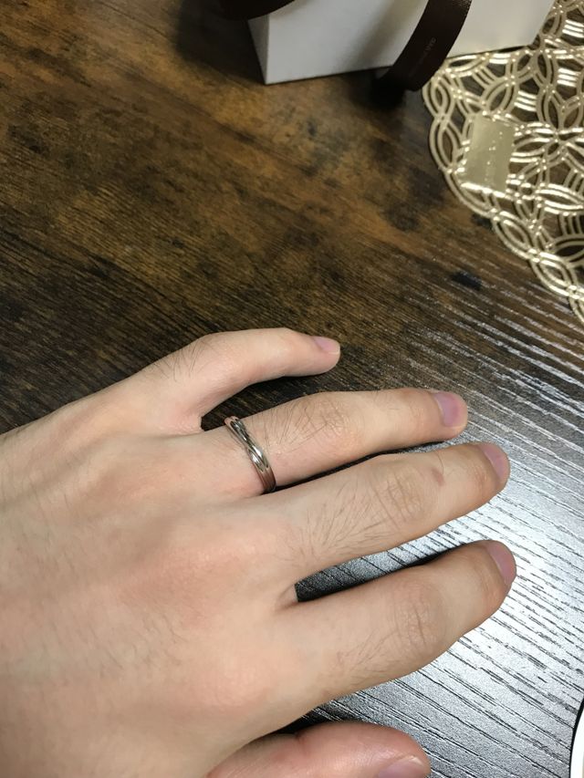 指輪はシンプルなもので、新婦の方がストレートの指輪に斜めにダイヤが入っているものを探していました。そのようなデザインでは、ほとんどの指輪が、単純にダイヤが斜めに入っているのに対し、選んだものは2本のリボンが交差するような形になっていて、そこに斜めにタイヤが入っている、ユニークなデザインです。新郎の指輪もタイヤはありませんが、同じ形になっていて、気に入りました。また着け心地も、とても良いです。