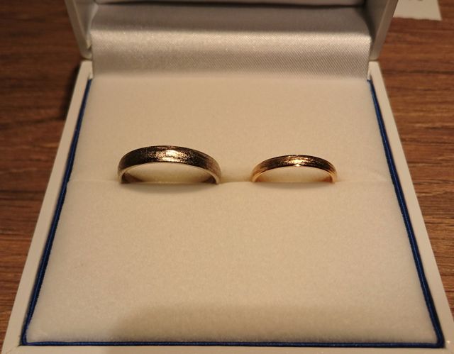 グレーゴールドとアプリコットゴールドという色味です。アプリコットゴールドはゴールドよりも少しだけ赤みがかっており、そのあたたかい色味に引かれました。表面は職人の手彫りで仕上げられており、マットな質感の指輪です。