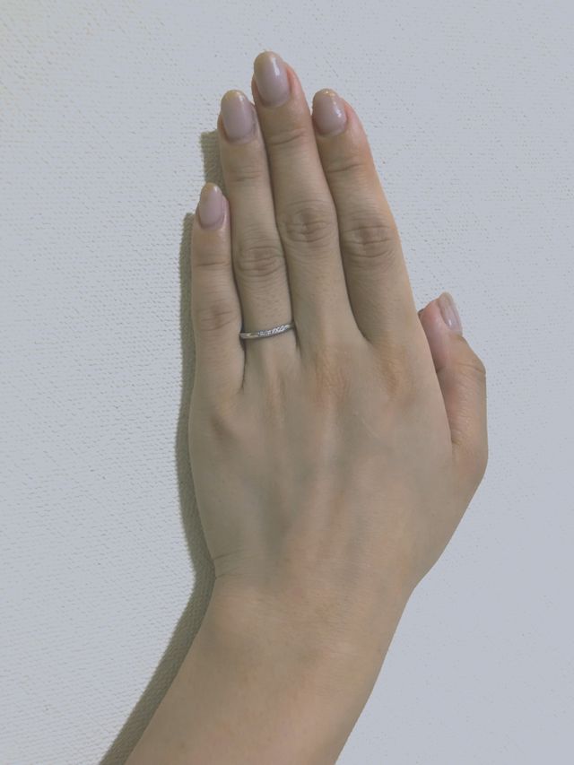 たくさん試着してきて、どこも可愛く指が綺麗に見えるデザインで決めるのも迷いましたが、先にもらっていた婚約指輪と重ね付けして合うかどうか、これから長い年月つけていくのに違和感がないかを最終判断にしました。
