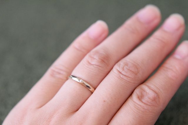私の地元である京都のデザイナーさんのブランド。何年も前からデザインの感性や雰囲気が好きで気になっていました。婚約指輪を購入して、ますます「いいなぁ」と感じていたので、結婚指輪も満足のいく仕上がりになりました。