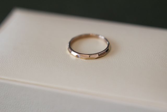 菩提樹をモチーフにしたという「リンデン」のデザインでペアオーダー。地金の表面がカットされていて、シンプルなのに光の加減でキラキラと輝き存在感のあるデザインです。女性用はゴールドの地金を鏡面仕上げ、1粒ダイヤを埋め込みました。