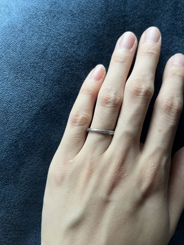 女性用は控えめなS字で、幅も細めなので自身の指にしっくりくると思い選びました。2人とも鏡面仕上げではなくサティーナ仕上げを選んだので艶を抑えつつも光沢もある感じが気に入っています。