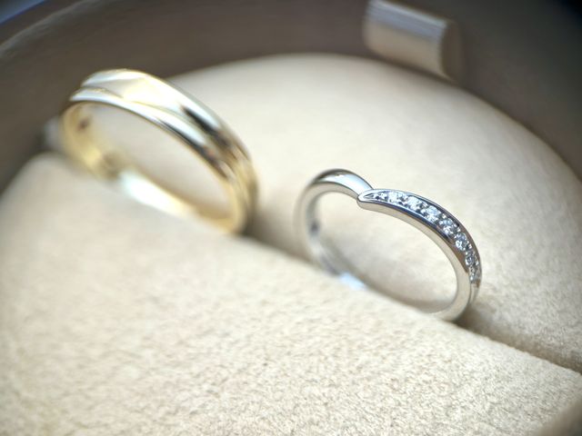 ダイヤモンドが片側だけに入ってるためシンプルすぎず派手すぎず普段使いからお呼ばれごとまで使用できるデザインです。リングの形がVになってるので指を長く見せる効果もあります!!婚約指輪との重ね付けも可愛いですよ!