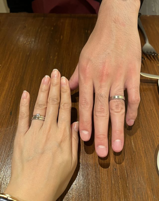 婚約指輪を先にこちらで購入していたので、重ね付けできるデザインを一緒に選んでいただきました。今回も時間がかかりましたが、たくさんの指輪を出していただきゆっくり見ることができました。デザイナーさんもいらしたので、アドバイスいただきながら楽しく指輪を選ぶことができました。
