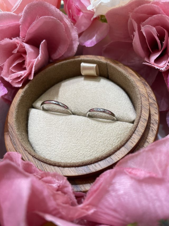 シンプルなデザインのものが良かったので、此方に決めました。他の物も試しましたが、1番つけ心地が良かったです。夫はシンプルに何もつけていません。私はダイヤを3つ入れました。ピンクよりブルーの方が好みだった為、真ん中の1つはアイスブルーにしました。