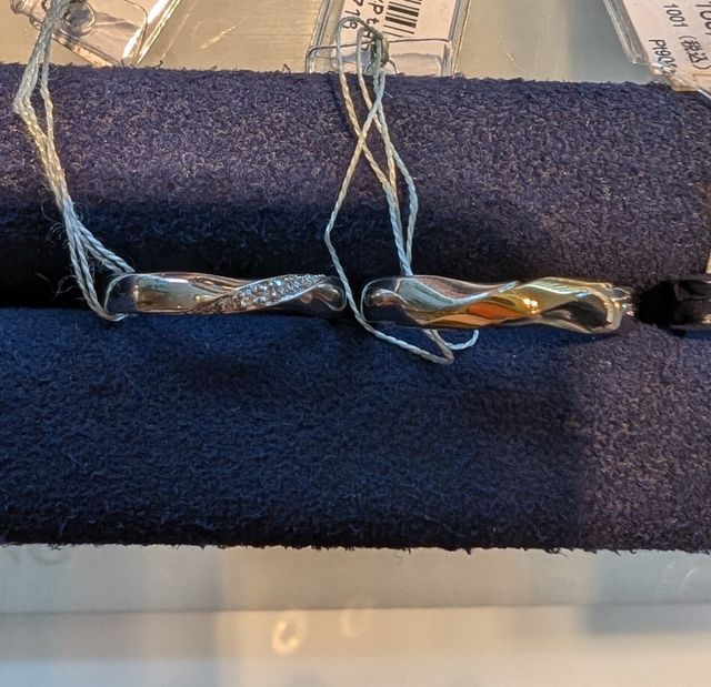 ねじれの部分が男性用はゴールド、女性用はダイヤでアクセントになっていて指がきれいに見えるデザインでした。