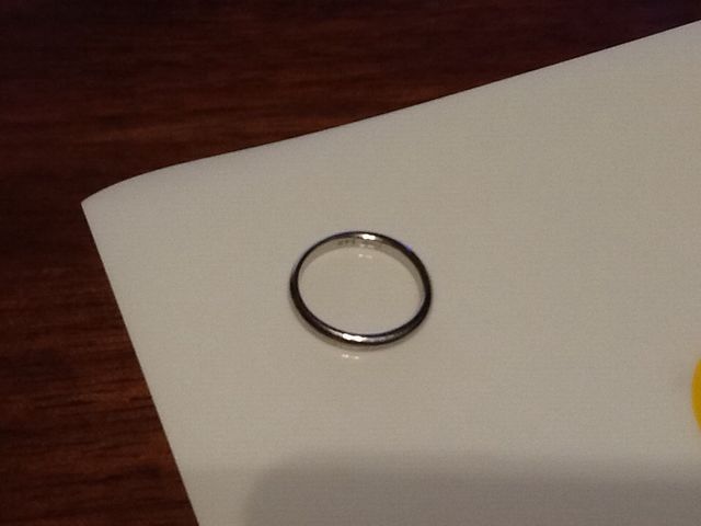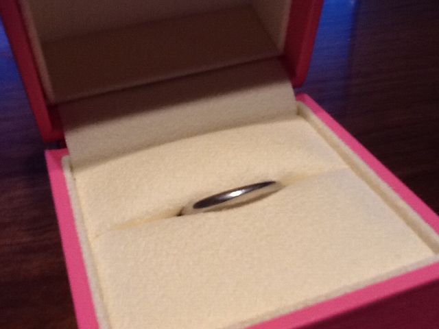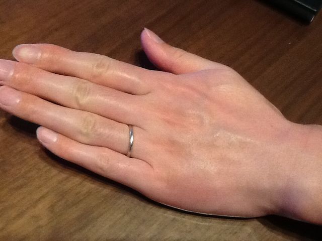 夫婦同じデザインの指輪でカーブの部分など同じデザインですが、妻はカーブに沿ってダイヤが入り、私のはダイヤの部分だけプラチナのつや消しになっています。デザインがさりげなく入っているので向きもわかるしシンプルだけど洗練されている。