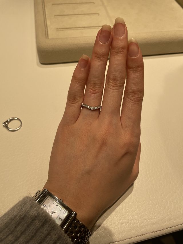 U字もしくはV字のデザインで探していたのですが、外資系ブランドはどこも30万以上するので、和光さんは品質もよく老舗なのにもかかわらずコスパがいいな、と思いました。ハーフエタニティのデザインを選びましたが、あとで有料にはなりますがサイズ変更ができる点も良かったです。